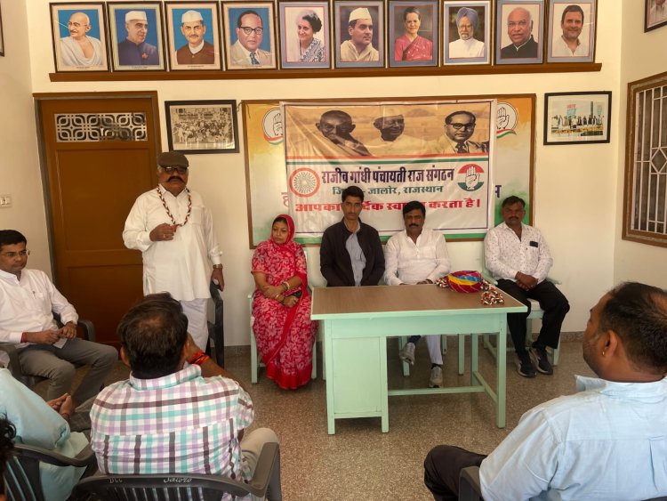 जालोर. राजीव गाँधी भवन जालोर में राजीव गाँधी पंचायती राज संगठन, जालोर की बैठक राजीव गाँधी पंचायती राज संगठन के राजस्थान प्रदेश प्रभारी जयंती भाटिया के मुख्य आतिथ्य में और जिला अध्यक्ष विनय व्यास की अध्यक्षता में आयोजित हुई। प्रदेश प्रभारी जयंती भाटिया ने बैठक को सम्बोधित करते हुये कहा कि भाजपा सरकार देश के लोकतंत्र को खत्म करना चाहती है I देश का संविधान खतरे में है I राजस्थान में पंचायती राज एवं नगर निकाय के चुनाव को भाजपा सरकार ने बार बार टालकर ग्रामीण और शहरी लोकतांत्रिक व्यवस्था को ही समाप्त कर दिया है I वर्तमान हालातों के मद्देनजर आज जनता कांग्रेस के प्रति उम्मीद की नजर से देख रही है I ऐसे में कांग्रेस कार्यकर्ता को मजबूती से धरातल पर सक्रिय रहने की आवश्यकता है I