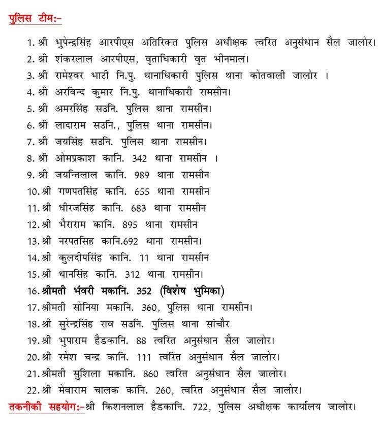 दिलीप डूडी, जालोर. जालोर जिले के बहुचर्चित गणपतसिंह मांडोली प्रकरण में एएसपी से लेकर तकनिकी सहयोगी समेत 23 पुलिस अधिकारियों-सिपाहियों की टीम अनुसन्धान में जुटी हुई थी, लेकिन टीम की सदस्य महिला कांस्टेबल भंवरी की एक ट्रिक ने पुलिस का काम आसान कर दिया और प्रकरण का पर्दाफाश हो गया। भंवरी की इस उपलब्धि पर पुलिस अधीक्षक शैलेंद्रसिंह इंदौलिया ने भी खुशी जाहिर करते हुए पुलिस मुख्यालय को विशेष भूमिका के रूप में नाम भेजा है।